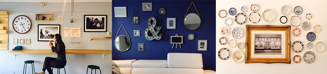 Viele verschiedene Gegenstände können im Rahmen einer Wandgalerie präsentiert werden, es müssen nicht nur immer Bilder sein. Dank flexibel einsetzbarer Haken und Schnüre sowie spezieller Aufhängesysteme können Wandgalerien sehr lebendig und dreidimensional ausstaffiert sein. Wie möchten Sie Ihre Wand dekorieren?